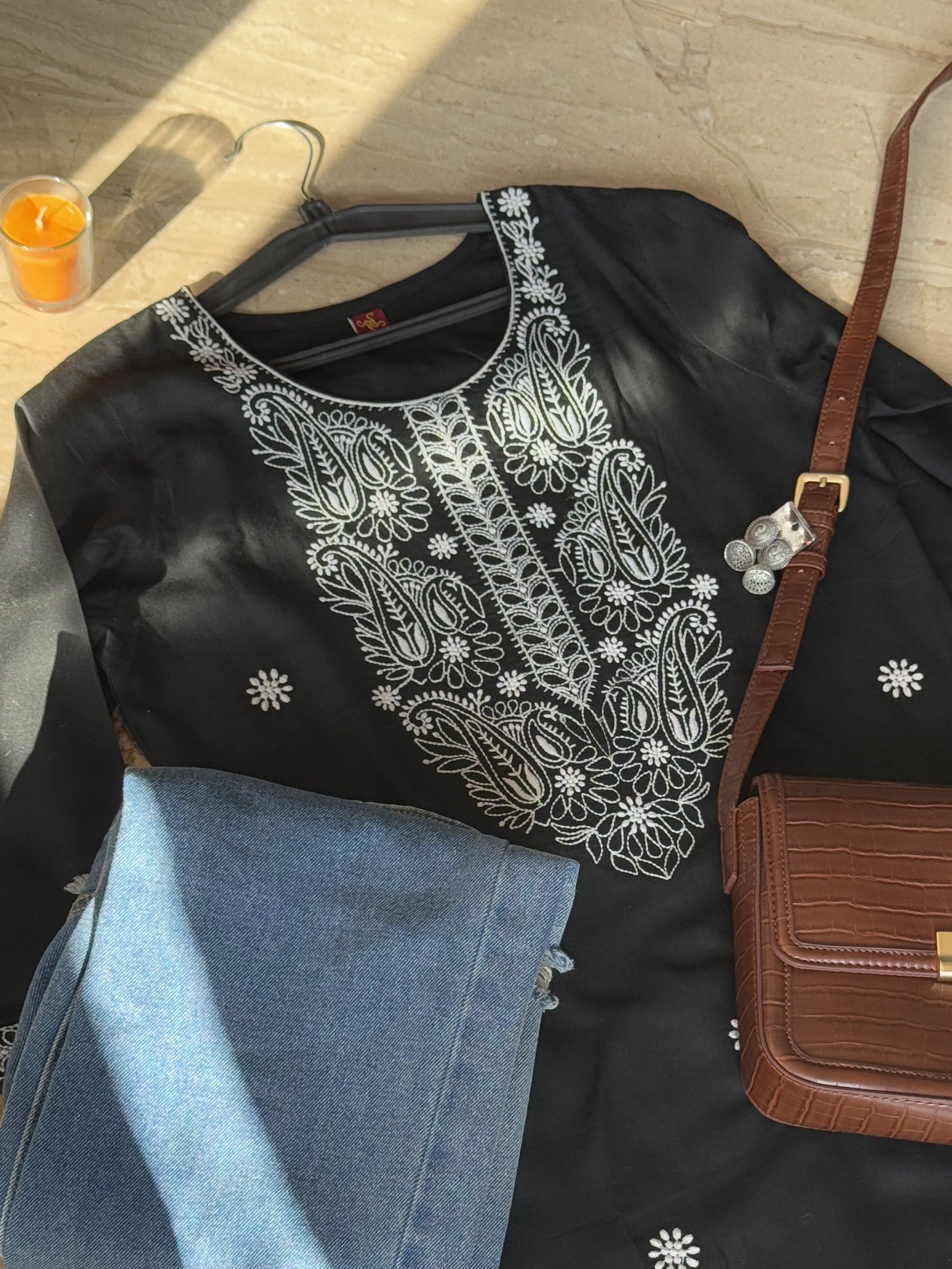 Neckline: Classic round neck with a heavily embroidered yoke.