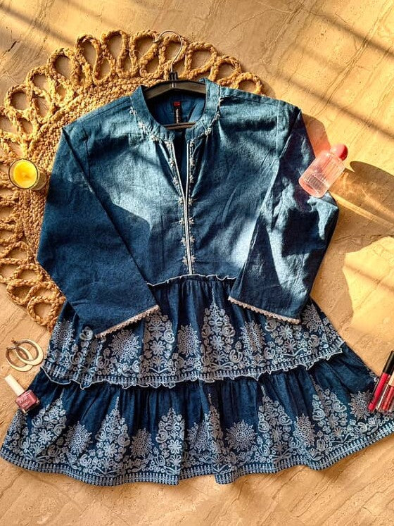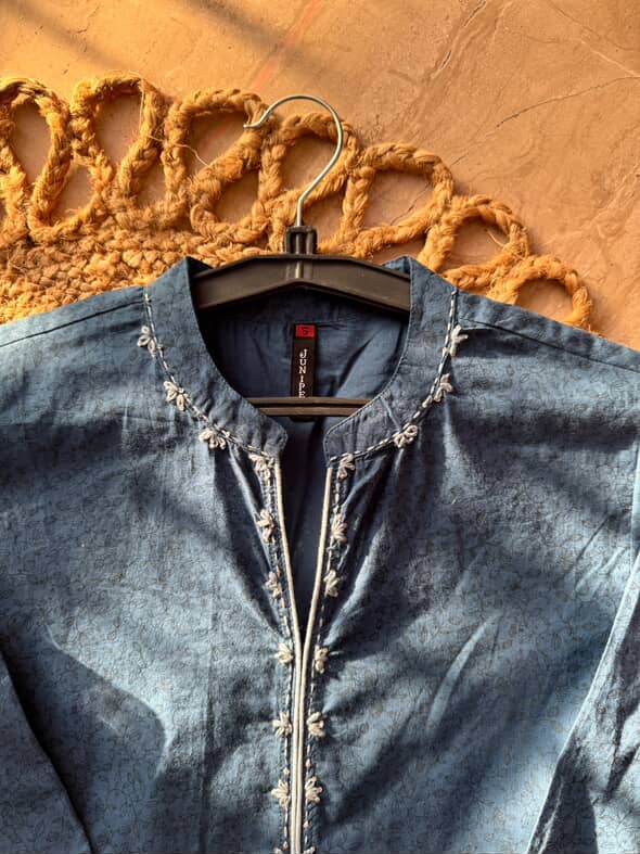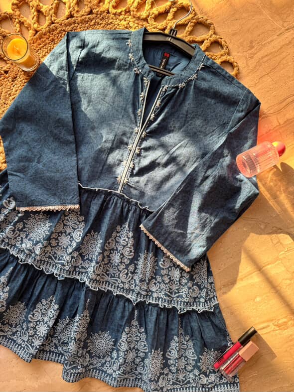 Chirpy, charming, and effortlessly elegant — Bulbul is all about twirls and tones. With a crisp collared neckline, triple-tier flare, and delicate white prints, this kurti brings desi grace with a fresh, girlish twist.