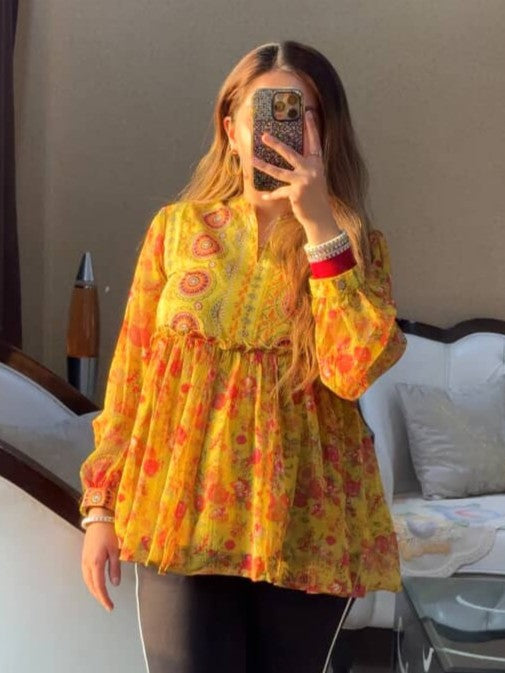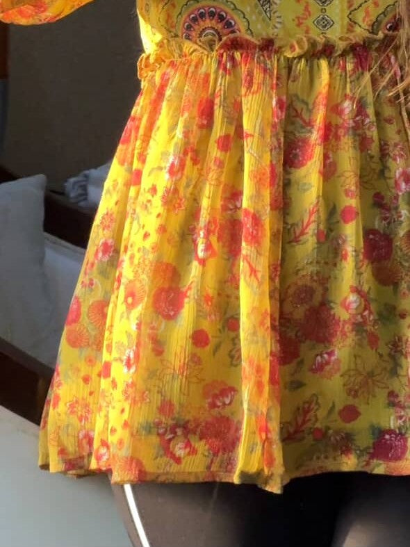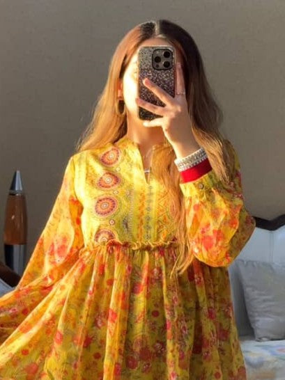 Color: Multicolor floral print on yellow base with a bold folk yoke