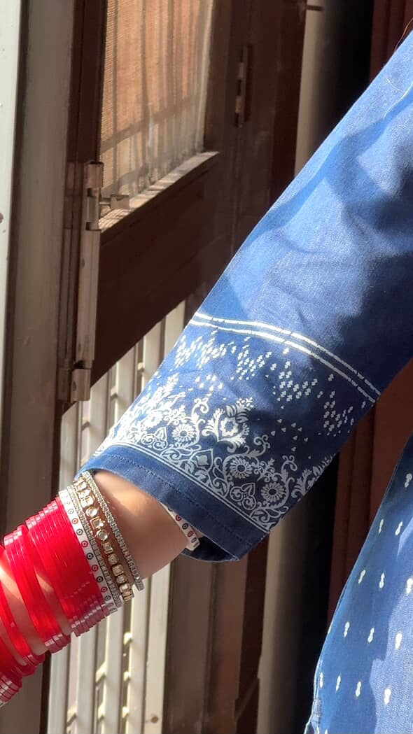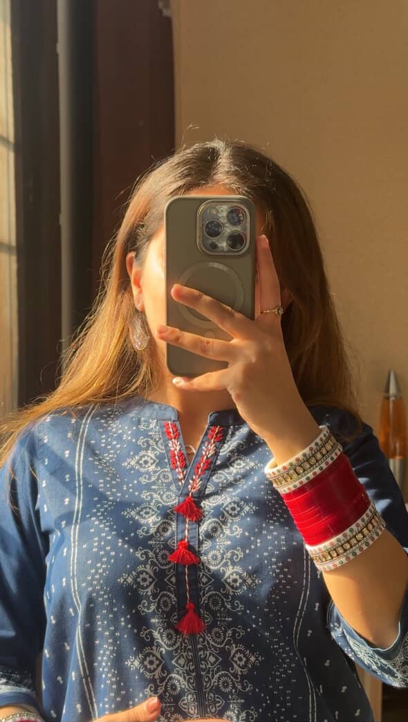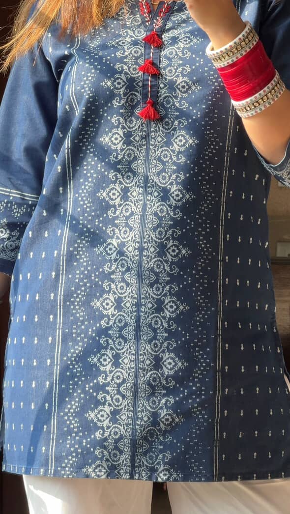 Neelam captures the timeless beauty of indigo with the comfort of denim. Adorned with intricate white prints and playful tassel details, it’s a kurti that moves effortlessly from casual mornings to festive evenings.