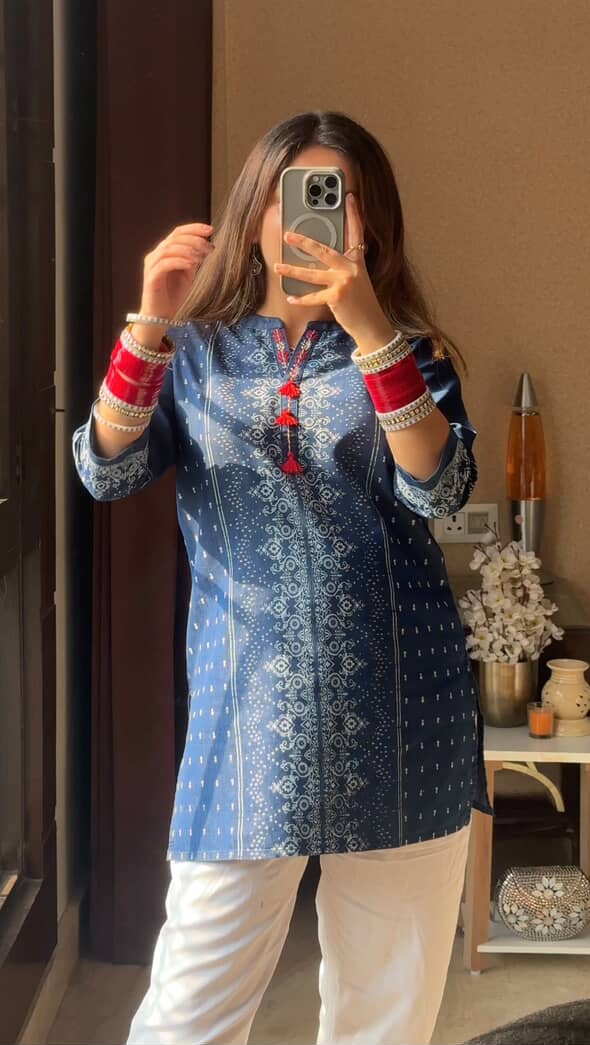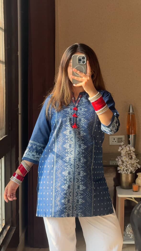 Length: Short kurti — versatile for pairing with trousers, palazzos, or jeans